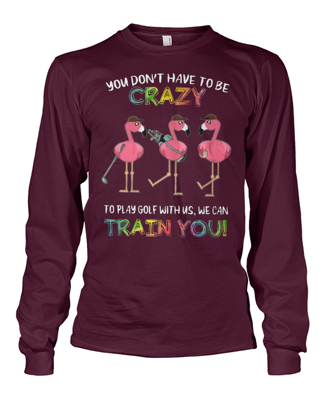 Or you can get it in here: https://www.moteefe.com/store/flamingo-you-dont-have-to-be-crazy-to-play-golf-with-us-we-can-train-you-shirt